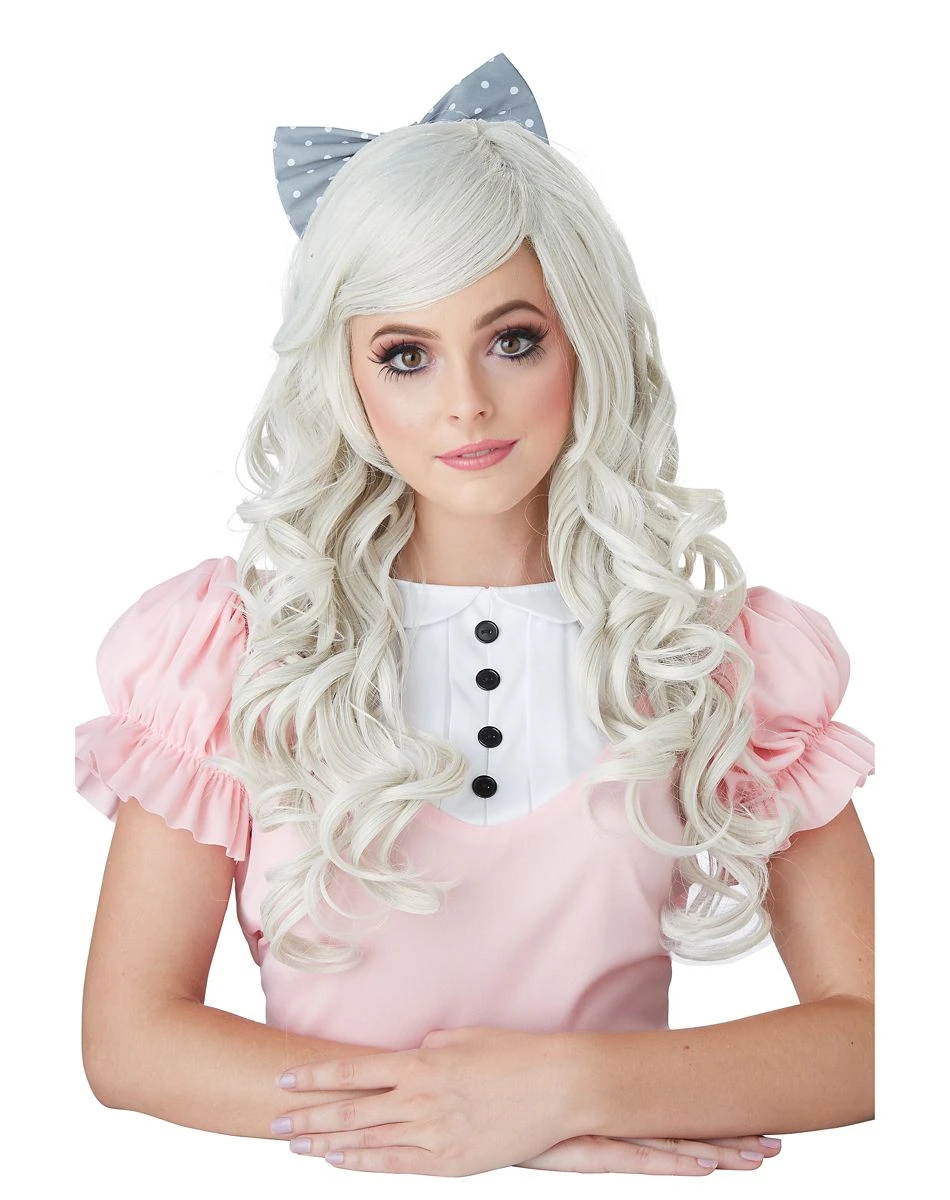 Complete your doll look in no time with this sweet doll wig! Featuring long bangs and ash blonde curls that fall down your shoulders, this wig has a sweet and innocent look to it that could compliment almost any costume.