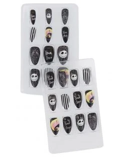Show your love of The Nightmare Before Christmas with these official Jack Skellington press on nails! These fun press on nails feature Jack’s smiling face as well as black and white stripes, black glitter, the words “true love” and a spiral design.