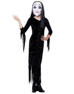 Welcome to the Addams family! Dress like the elegant Morticia with this kids’ Morticia Addams costume. This costume features a long, dark dress with tattered sleeve and hem details. A stark white mask with raised brows, smoky eyes, and rosy lips pairs perfectly with a long, dark wig. With this costume and a snap of your fingers, you’ll look just like Morticia Addams.
