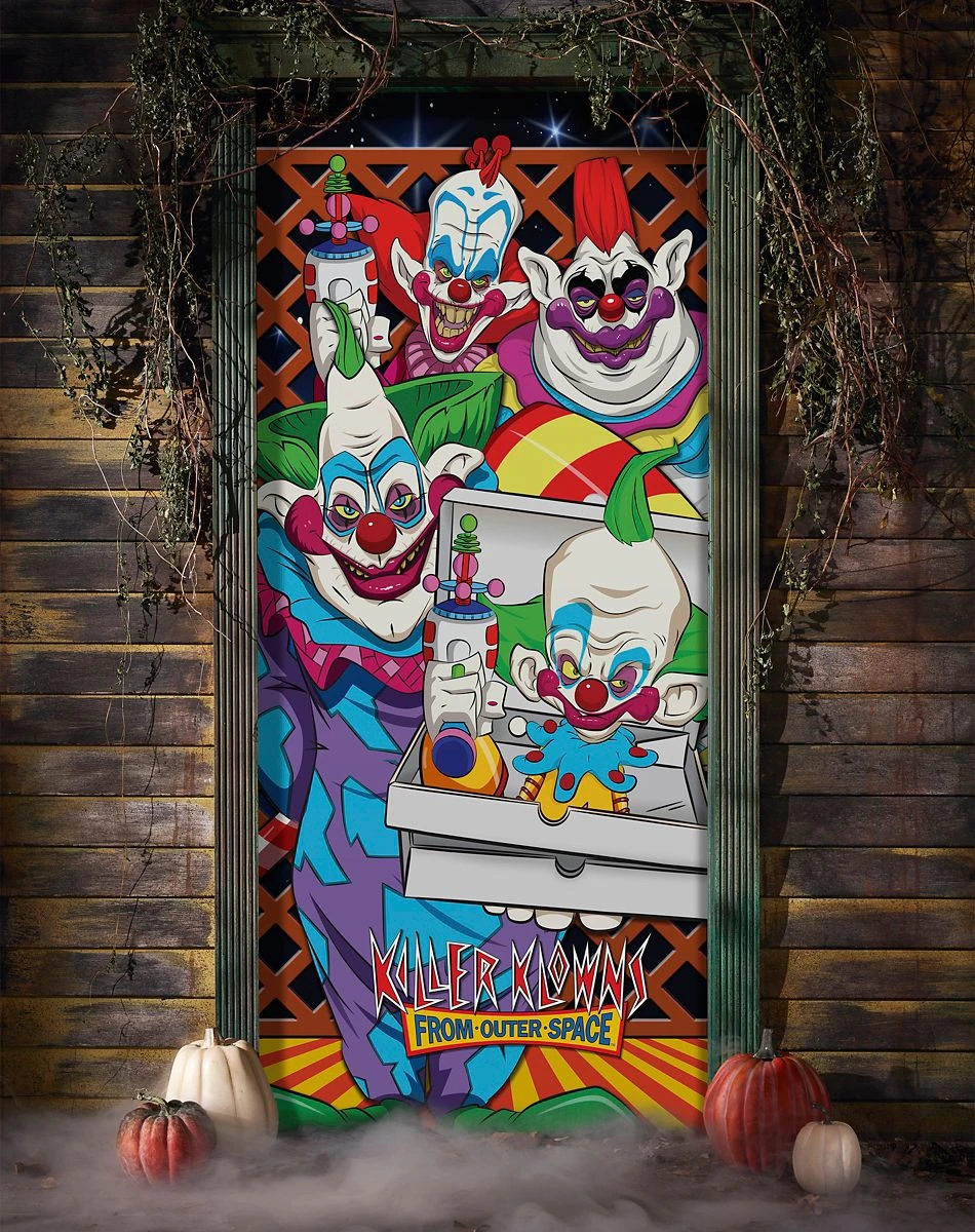 Give your home a haunting look this Halloween when you hang this officially licensed Killer Klowns from Outer Space door cover. Scare all your guests and show love for your favorite horror movie!