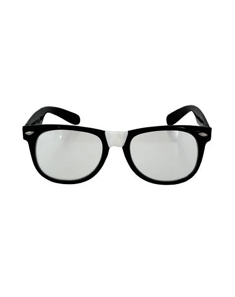 - The School Nerd glasses are made of black plastic with clear lenses and “repaired” with white tape.
