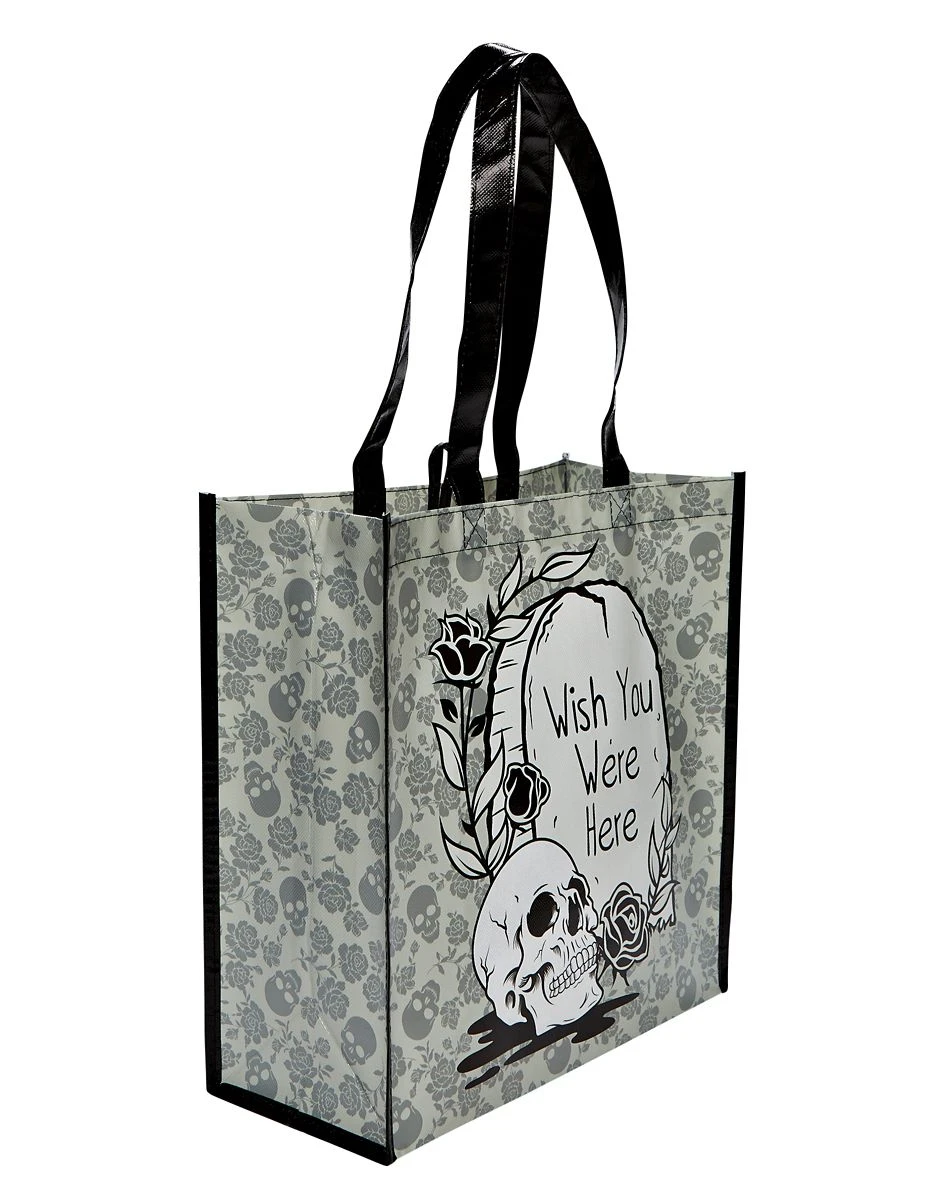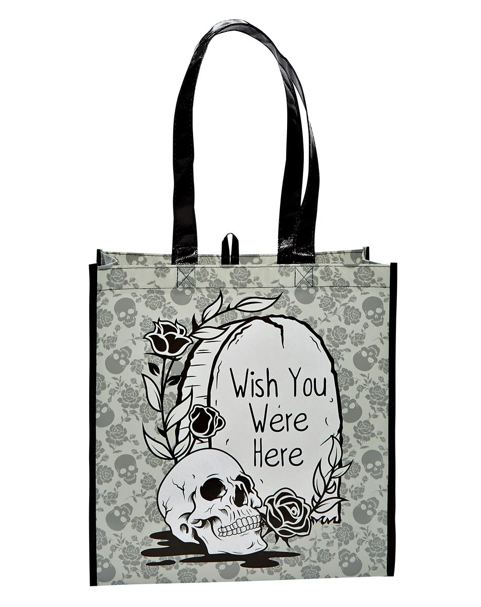 Collect your candy in style this Halloween when you use this stylish skull themed Wish You Were Here Tote Bag. This tote bag features a skull and black roses design on it and is the perfect tote bag to take along trick-or-treating this Halloween.